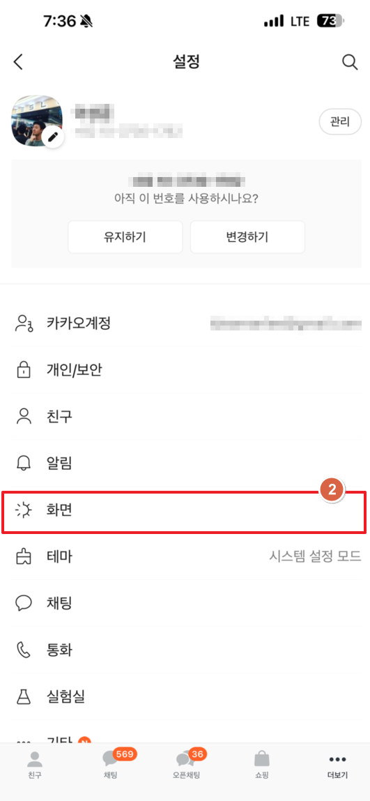 카톡 배경화면 자유롭게 변경하실 수 있습니다. 방법은 글자크기/글씨체 변경하기 경로와 동일하면 2번 화면 선택을 선택한 후"배경화면"을 터치하시면 1번 배경선택에서 선택하실 수 있습니다.